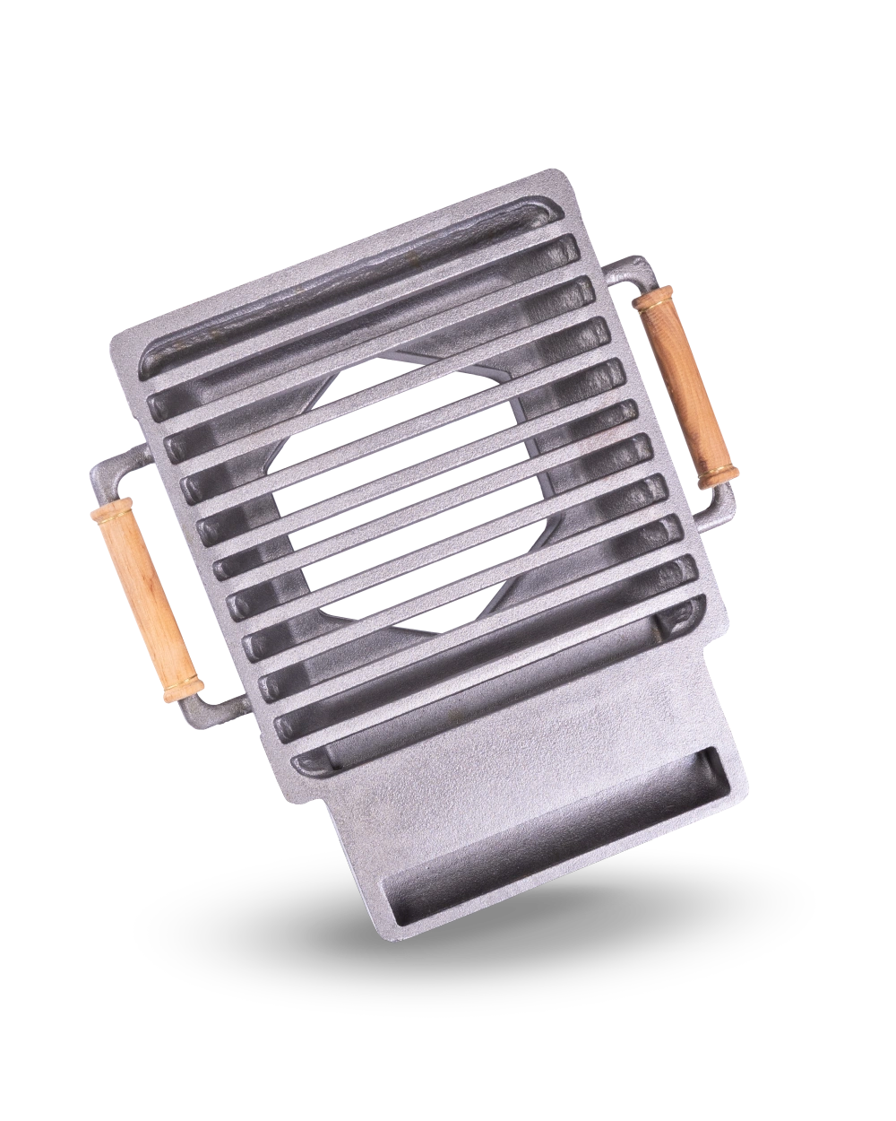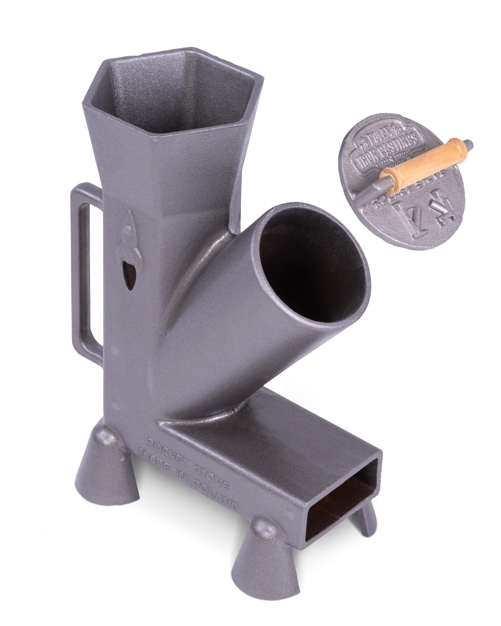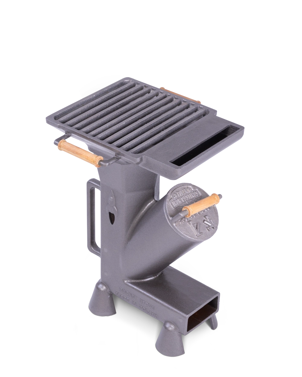 Sercem zestawu jest masywny piecyk rakietowy żeliwny DUKE, który pracuje wydajnie i pozwala osiągać wysoką temperaturę przy niewielkiej ilości drewna. Uzupełnia go ruszt żeliwny do grilla 25 x 25 cm, który daje prostą i wygodną powierzchnię do klasycznego grillowania bezpośrednio nad ogniem.