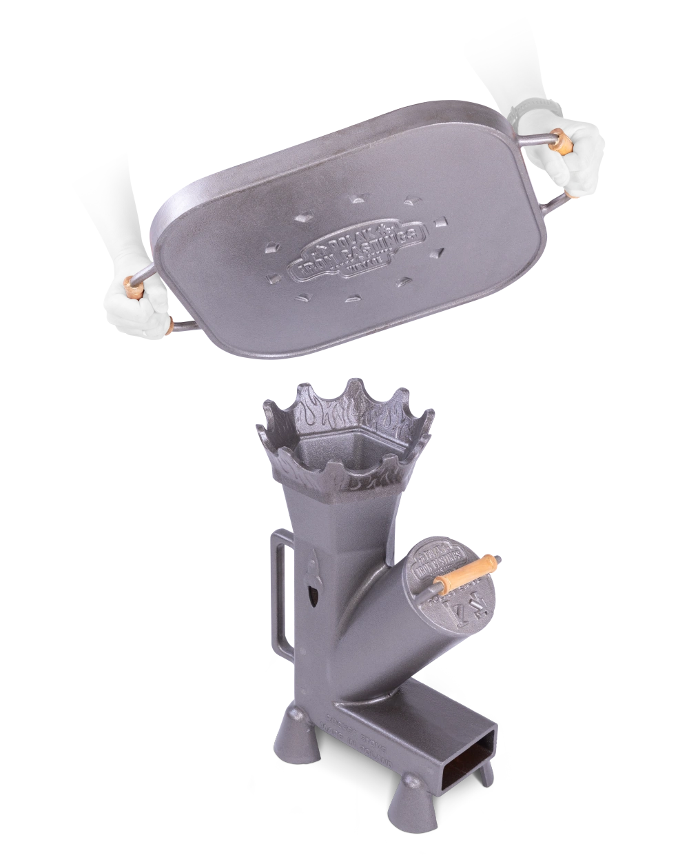 Sercem zestawu jest mały piecyk rakietowy DUKE, który pracuje wydajnie i pozwala osiągać wysoką temperaturę przy niewielkiej ilości drewna. Uzupełnia go żeliwna korona, stabilizująca naczynie nad wylotem piecyka, oraz duża żeliwna patelnia grillowa, która zapewnia wygodną powierzchnię do smażenia różnych potraw.