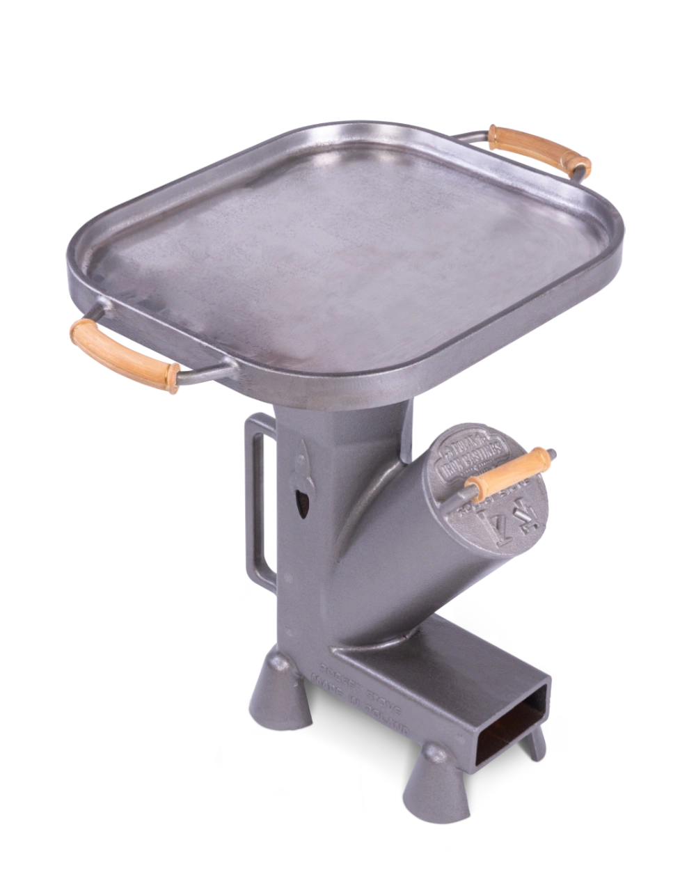 Piecyk rakietowy DUKE stanowi podstawę całego zestawu i odpowiada za wydajne spalanie drewna oraz wytwarzanie intensywnego ciepła potrzebnego do gotowania i smażenia na żywym ogniu. Masywna żeliwna konstrukcja dobrze akumuluje temperaturę, a bardziej kompaktowa forma sprawia, że ten mały piecyk rakietowy dobrze sprawdza się jako rozwiązanie do regularnego użytkowania na zewnątrz.