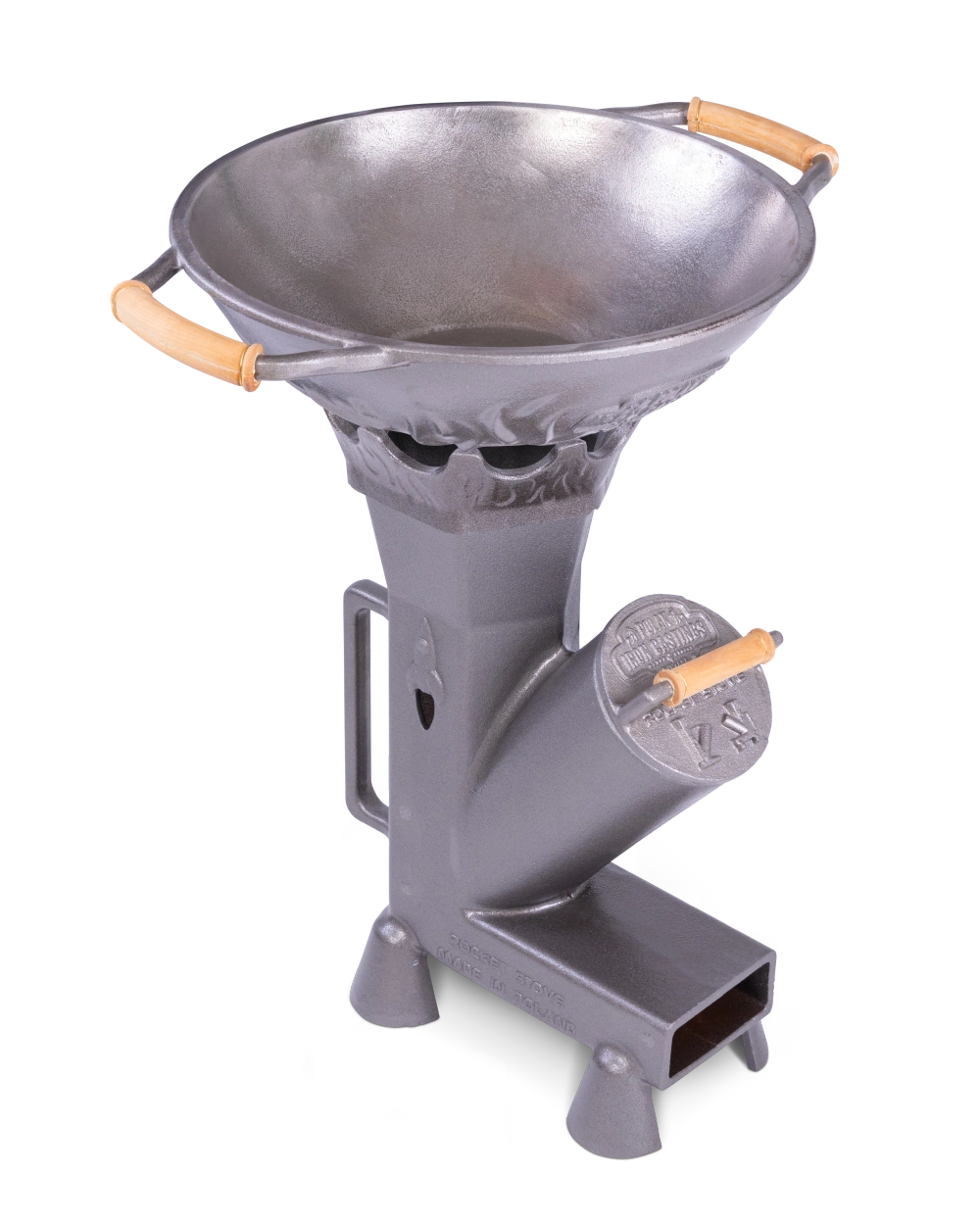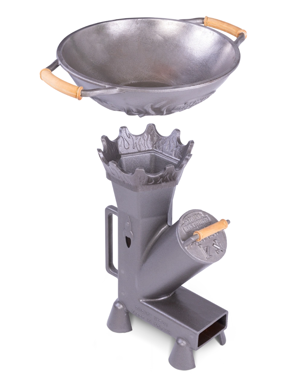 Sercem zestawu jest piecyk rakietowy żeliwny DUKE, który pracuje wydajnie i osiąga wysoką temperaturę przy niewielkiej ilości drewna. Korona stabilizuje WOK nad wylotem piecyka, a sam WOK rozszerza możliwości zestawu o gotowanie w stylu, który dobrze sprawdza się przy daniach warzywnych, mięsnych, duszonych i przygotowywanych na dużym ogniu.