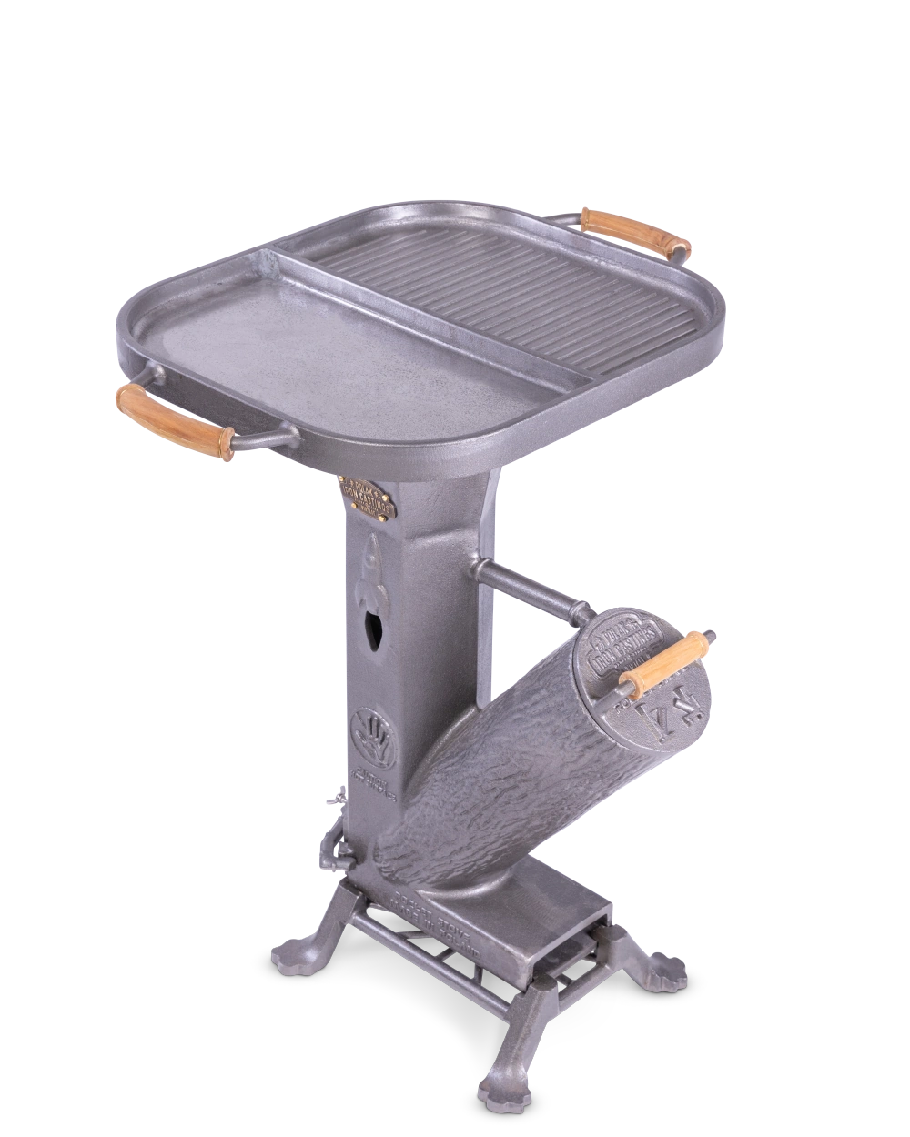 Jej masywna żeliwna konstrukcja dobrze współgra z charakterem piecyka i pozwala bezpiecznie korzystać z cięższego naczynia podczas pracy w wysokiej temperaturze.