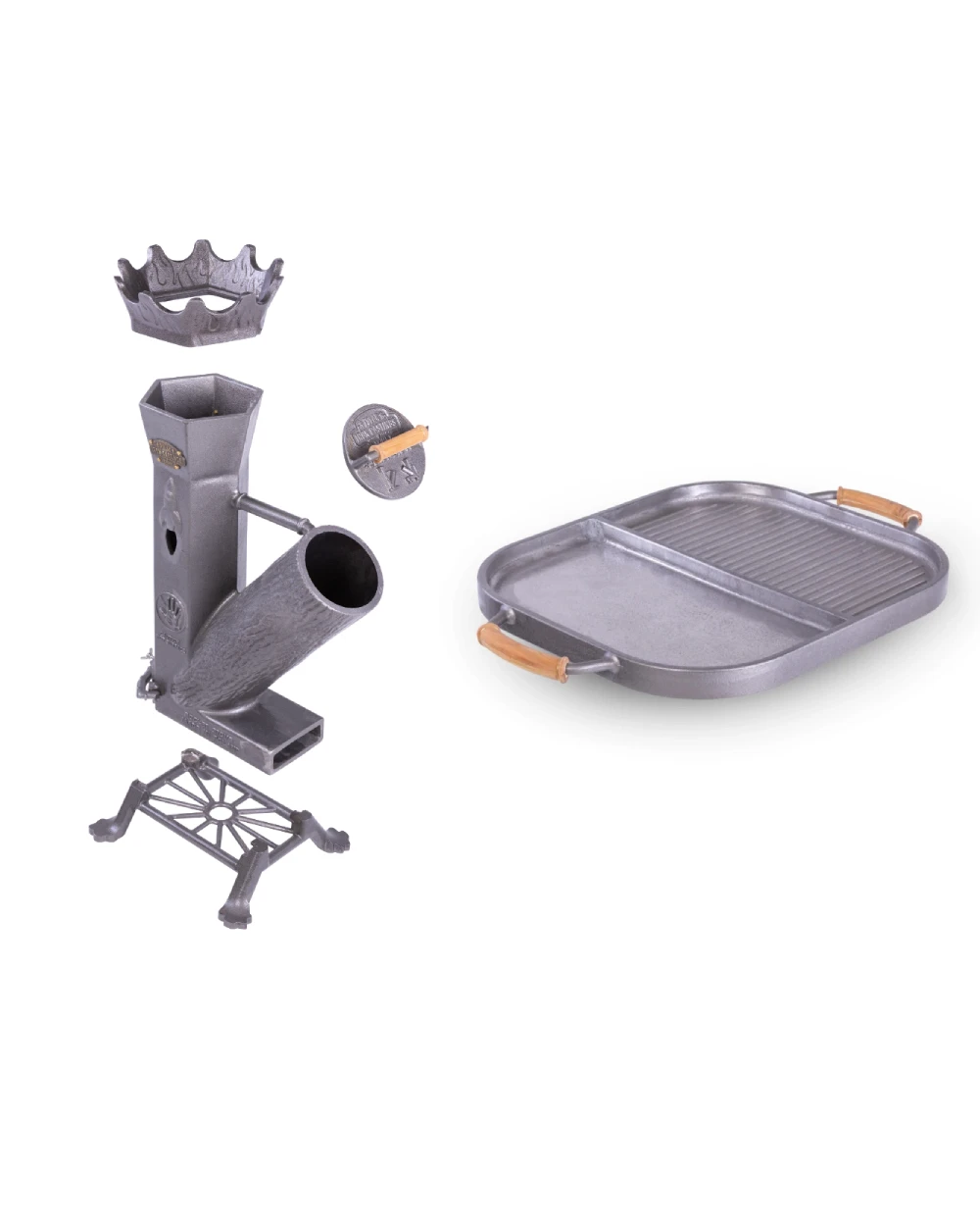Sercem zestawu jest masywny żeliwny piecyk rakietowy KING, który pracuje wydajnie i osiąga wysoką temperaturę przy niewielkiej ilości drewna. Korona tworzy stabilne oparcie dla patelni, a duża żeliwna patelnia grillowa dzielona na pół daje dwie osobne strefy pracy, co ułatwia równoczesne smażenie mięsa, warzyw i dodatków.