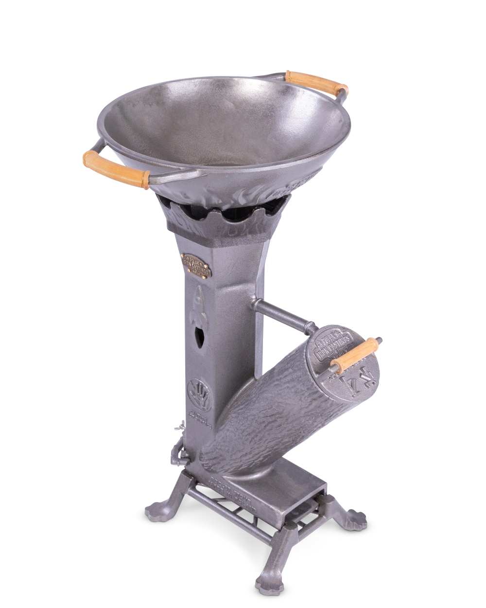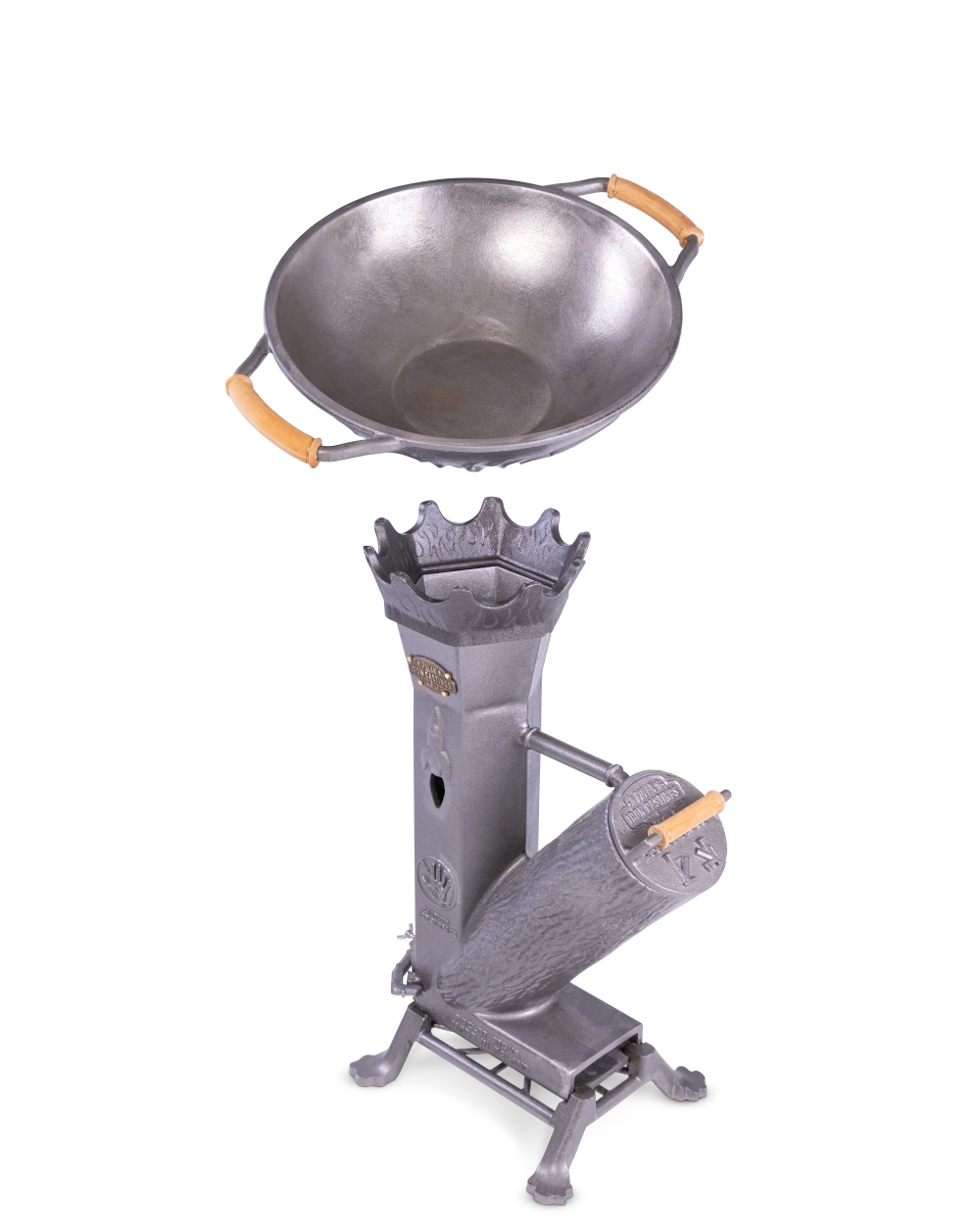 Gotowy zestaw z piecykiem rakietowym KING, koroną i WOK-iem 38 cm do gotowania na żywym ogniu. Piecyk rakietowy żeliwny zapewnia wydajne źródło ciepła, a wok żeliwny na grilla pozwala wygodnie przygotowywać dania warzywne, mięsne i potrawy inspirowane kuchnią orientalną w ogrodzie lub na działce.